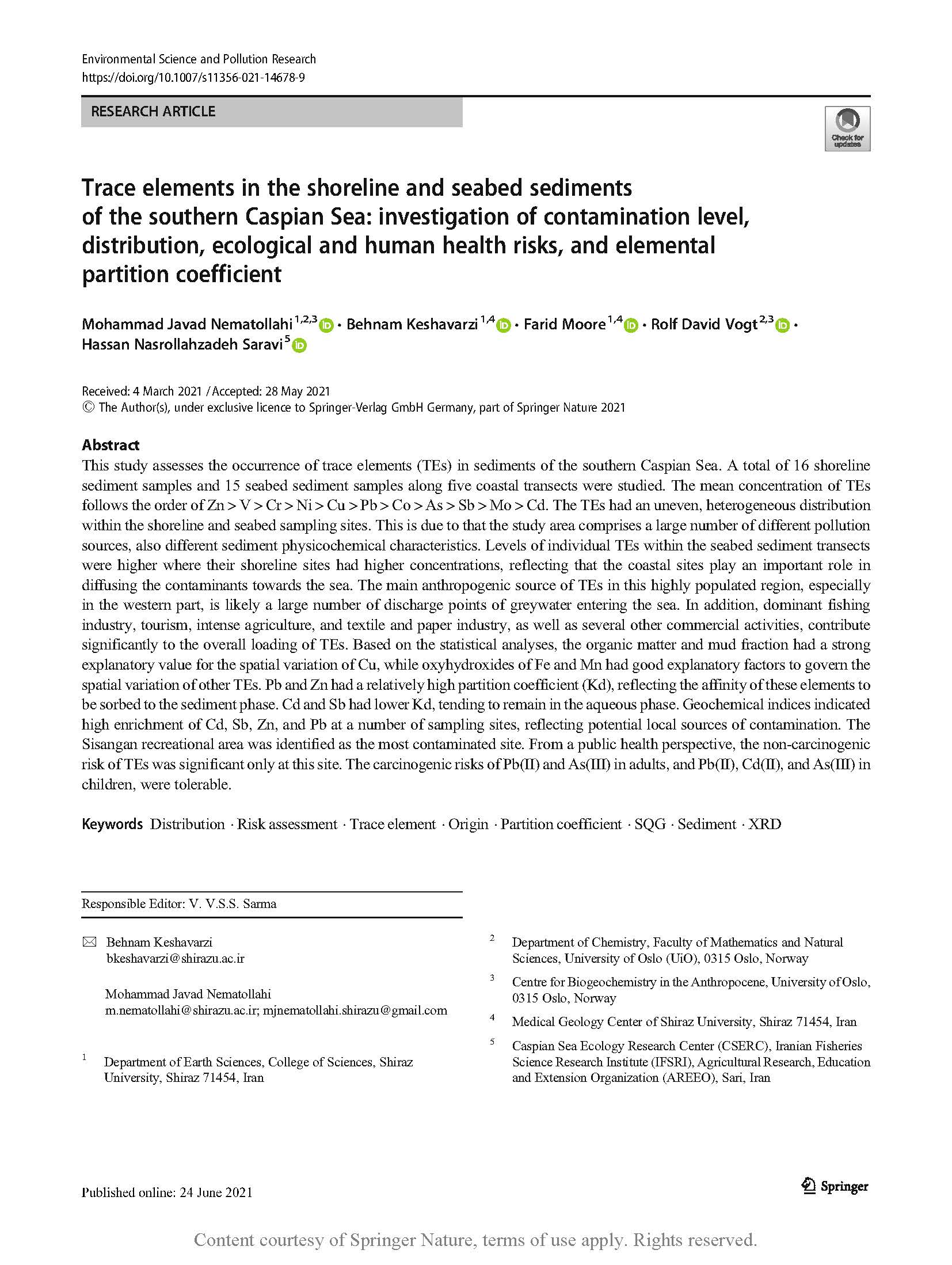 Abstract: This study assesses the occurrence of trace elements (TEs) in sediments of the southern Caspian Sea. A total of 16 shoreline sediment samples and 15 seabed sediment samples along five coastal transects were studied. The mean concentration of TEs follows the order of Zn > V > Cr > Ni > Cu > Pb > Co > As > Sb > Mo > Cd. The TEs had an uneven, heterogeneous distribution within the shoreline and seabed sampling sites. This is due to that the study area comprises a large number of different pollution sources, also different sediment physicochemical characteristics. Levels of individual TEs within the seabed sediment transects were higher where their shoreline sites had higher concentrations, reflecting that the coastal sites play an important role in diffusing the contaminants towards the sea. The main anthropogenic source of TEs in this highly populated region, especially in the western part, is likely a large number of discharge points of greywater entering the sea. In addition, dominant fishing industry, tourism, intense agriculture, and textile and paper industry, as well as several other commercial activities, contribute significantly to the overall loading of TEs. Based on the statistical analyses, the organic matter and mud fraction had a strong explanatory value for the spatial variation of Cu, while oxyhydroxides of Fe and Mn had good explanatory factors to govern the spatial variation of other TEs. Pb and Zn had a relatively high partition coefficient (Kd), reflecting the affinity of these elements to be sorbed to the sediment phase. Cd and Sb had lower Kd, tending to remain in the aqueous phase. Geochemical indices indicated high enrichment of Cd, Sb, Zn, and Pb at a number of sampling sites, reflecting potential local sources of contamination. The Sisangan recreational area was identified as the most contaminated site. From a public health perspective, the non-carcinogenic risk of TEs was significant only at this site. The carcinogenic risks of Pb(II) and As(III) in adults, and Pb(II), Cd(II), and As(III) in children, were tolerable.